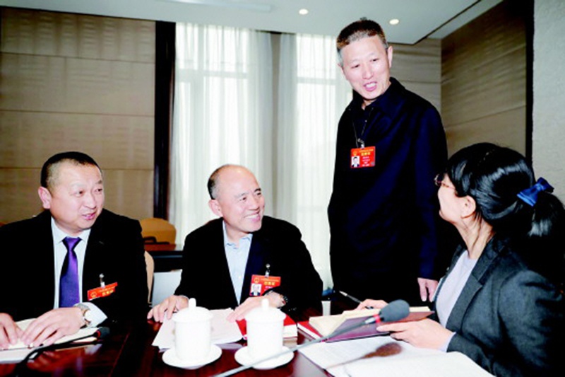 3月9日,山東代表團周建軍(左一)、周洪江(右二)等代表討論宮明杰代表(左二)提出的提高經濟作物種植機械化程度的建議。