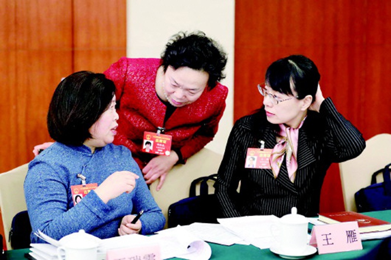 山東代表團代表胡桂花(中)、王瑞霞(左)、王雁,討論支持民營企業發展的政策舉措如何落地落實。(轉自《大眾日報》手機客戶端